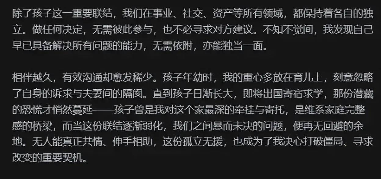 而今天,13岁的犬子远赴国外修业,邓莎也接近40岁,日前她发布了一篇长文,似乎在浮现,十几年的心绪行将走到非常。难谈她和丈夫确切无法再走下去了吗?