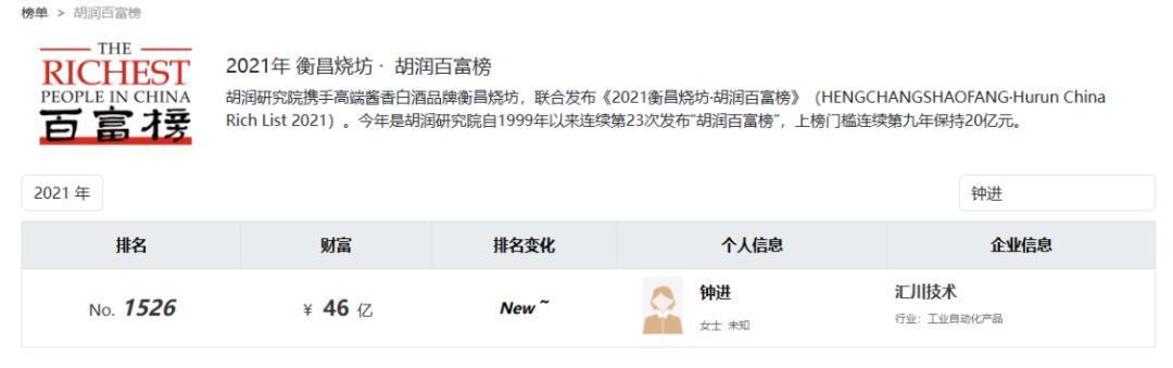 2021年7月9日,朱兴明与太太钟进破除婚配联系,并将其名下约7030.03万股汇川股份分割给后者,占彼时公司股份总和的2.6822%。按公告当日每股79.2元的收盘价计较,这批股票价值约55.68亿元。这也让钟进身家暴涨,踏进当年胡润百富榜第1526位。