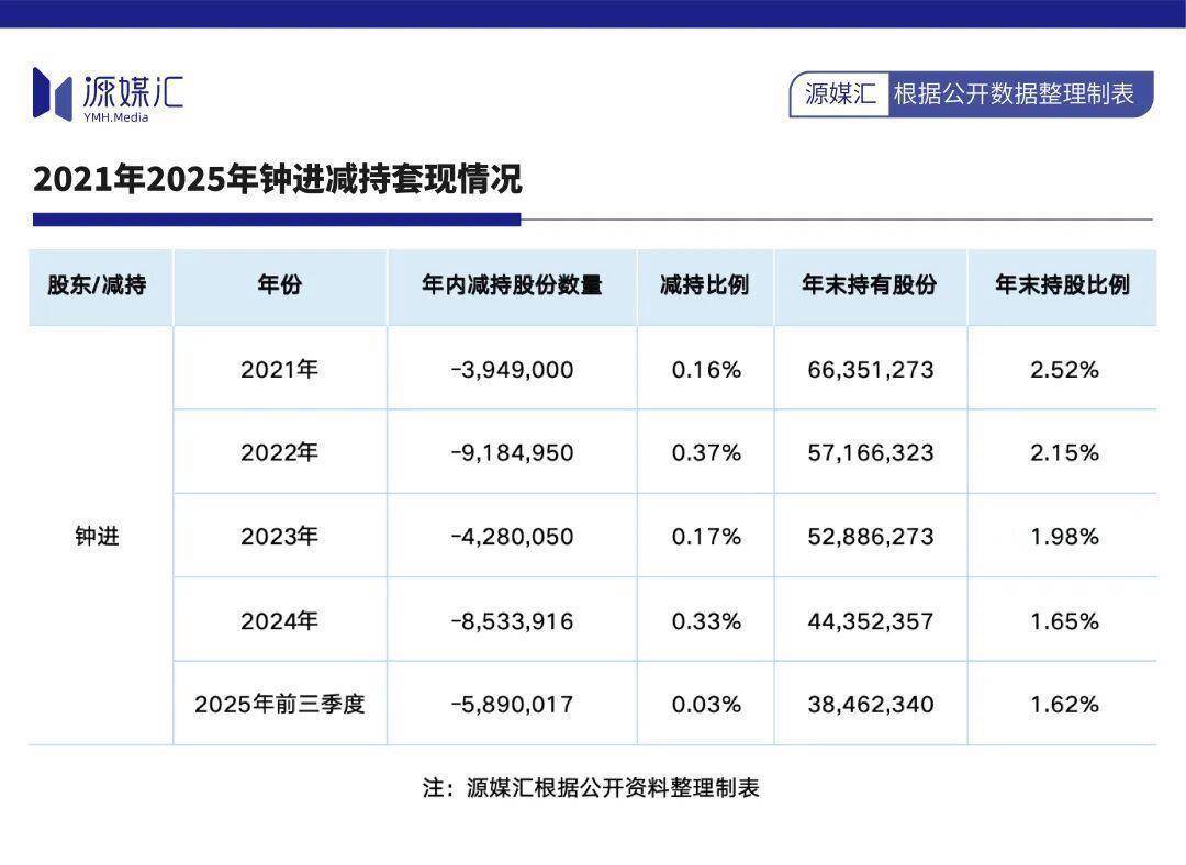 2021年至2025年前三季度,钟进年内辨别减持394.90万股、918.49万股、428.00万股、853.39万股和589.00万股,多番减持后其持股数目已降至3846.23万股。