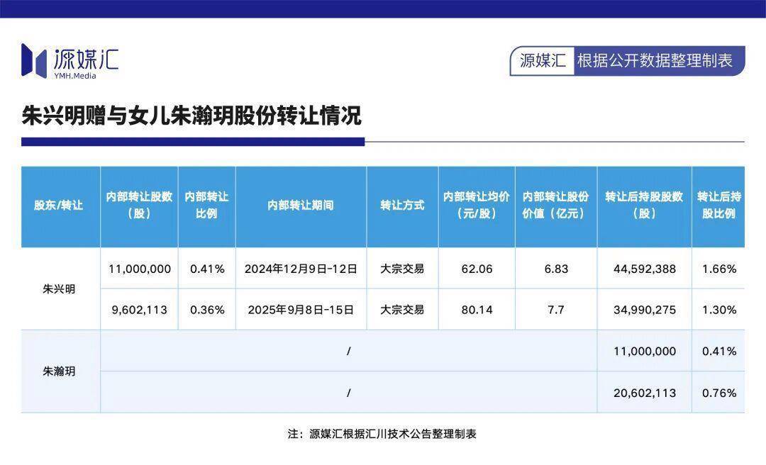 这笔赠与贪图通过四年时刻分步扩充完成。字据公告露馅,2022年,上述汇川投资的股权领先完成过户;2024年12月和2025年9月,朱兴明通过巨额来回辨别向朱瀚玥转让1100万股、960.21万股汇川股份,转让均价辨别为每股62.06元、80.14元,转让股份价值辨别约6.83亿元、7.7亿元。