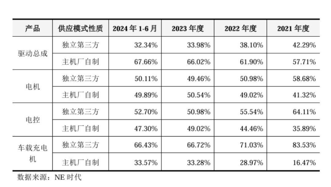 以国内新能源乘用车能源系统产业为例,2021年至2024年上半年,驱动总成由零丁第三方供应的市集份额从42.29%降至32.34%,电机58.68%降至50.11%,电控和车载充电机则辨别由64.11%、83.53%降至52.7%、66.43%。固然各自下滑幅度有所不同,但举座均呈现出走低趋势。而主机厂好处份额在零部件市集则呈现出不同幅度的走高。