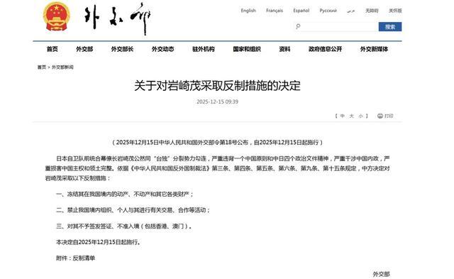 2025年12月15日,中国际交部依据《反异邦制裁法》,对岩崎茂实施了冻结在华财富、装扮往返合作、不准入境等一系列精确制裁。